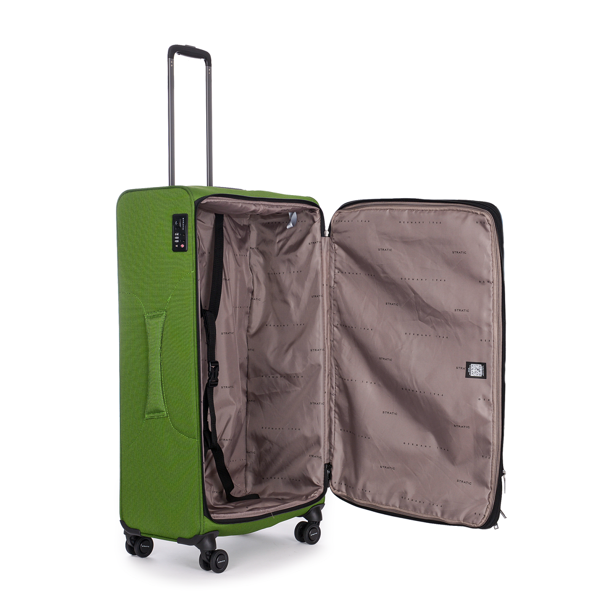 Ein leichtläufiges, 360° drehbares, 4-Doppelrollensystem und ein ergonomisch geformter Griff, an einem arretierbaren 3-Punkt Teleskopgestänge aus Aluminium, lassen den super leichten BENDIGO LIGHT+-Koffer, Größe L, sehr komfortabel führen und auch voll bepackt ist er so sehr wendig und leichtläufig. Die Teleskopgestänge der BENDIGO LIGHT+ Serie sind zudem so angelegt, dass sich auch zwei Koffer der Serie zeitgleich mit nur einer Hand ziehen lassen. Größe L verfügt zudem über ein bis zu 114cm ausfahrbares Gestänge, welches damit das weltweit höchste Teleskopgestänge bei einem Koffer ist. Zwei aufgesetzte Fächer für den schnelleren Zugriff auf Reisen sind mit einem hochwertigen Reißverschluss versehen. Das sehr geräumige Hauptfach des BENDIGO LIGHT+ ist mit feingewebtem Polyester und einem 2-Wege-Reißverschluss ausgestattet. Im Kofferinnenraum befinden sich ein Reißverschluss-Hauptfach und ein Reißverschluss- Hemdenfach mit hoch belastbaren Kreuzspanngurten. Für höchstes Packvolumen ist der BENDIGO LIGHT+ über einen zusätzlichen Reißverschluss am Deckelfach noch größentechnisch erweiterbar. Die Ausstattung mit einem TSA-Schloss für Reisen in die USA und Großbritannien ist selbstverständlich. Es ist durch den Zoll einfach ohne Aufbruch zu öffnen. Tragegriffe sind an der Kofferoberseite und seitlich des Koffers vorhanden. Neu ist die Ausstattung mit dem STRATIC CONNECT NFC-Chip.