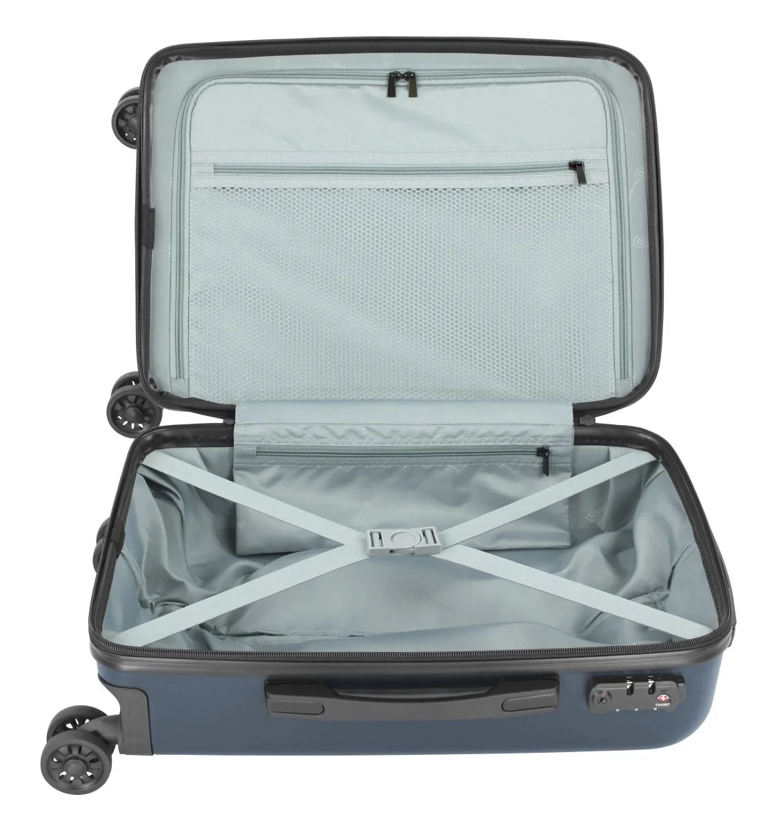 Dieser Trolley mit vier stabilen Rollen, Teleskopgriff, zwei gepolsterten Tragegriffen und TSA-Zahlenschloss bietet ein geräumiges Hauptfach mit Kreuzspanngurt und Reißverschlussfach sowie ein Hemdenfach und ein großes Netzfach. Die hochwertige Hartschale aus 40% ABS und 60% PC ist extrem robust, unempfindlich für Kratzer und rundet das Gesamtbild dieser tollen Koffer Serie ab.