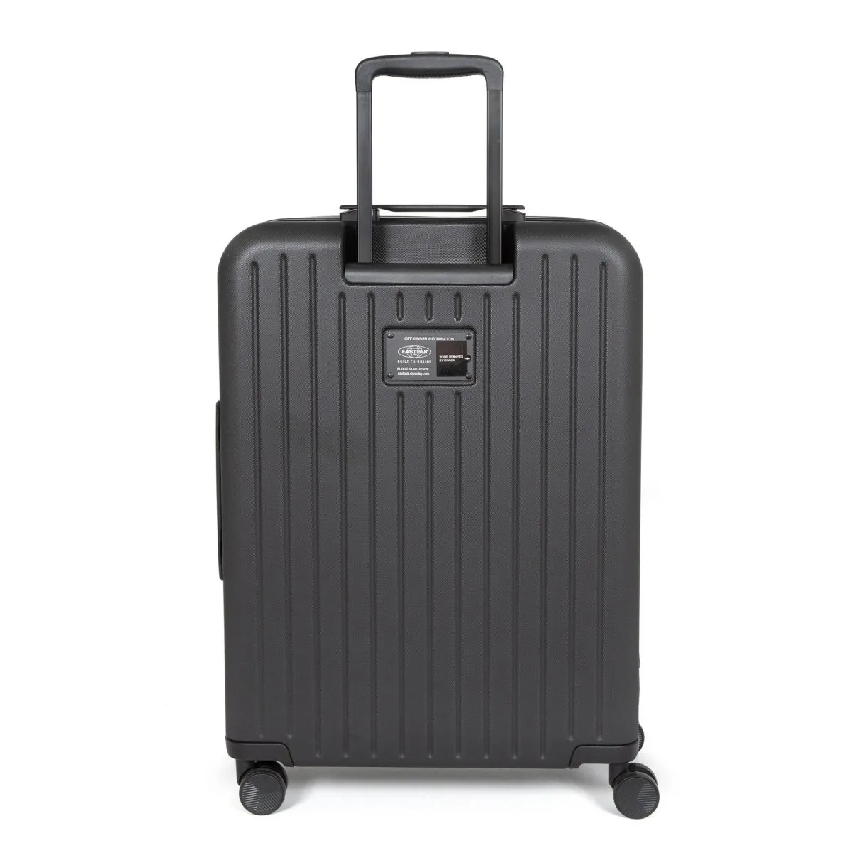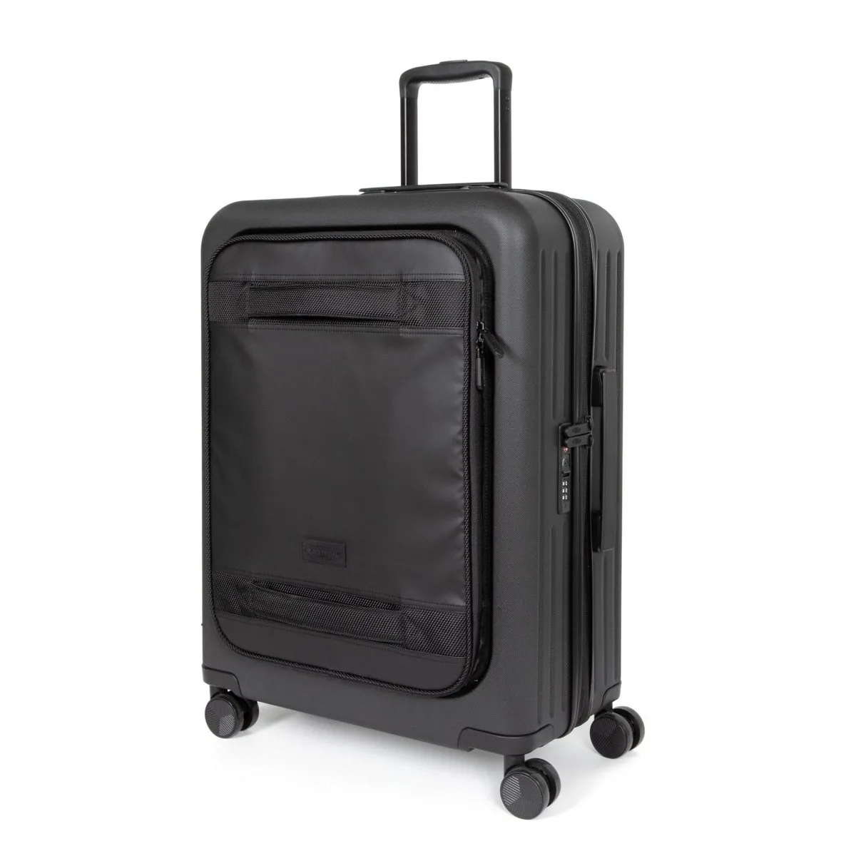 Hartschalen-Reisetrolley von Eastpak aus der CNNCT-Kollektion. Zwei Fächer mit Reißverschlusstasche vorne. Hergestellt aus 100 % Polyester (100 % veganes Produkt, hergestellt ohne Verwendung tierischer Produkte). Teleskopgriff, 360-Grad-Drehräder und integriertes dreistelliges TSA-Codeschloss.