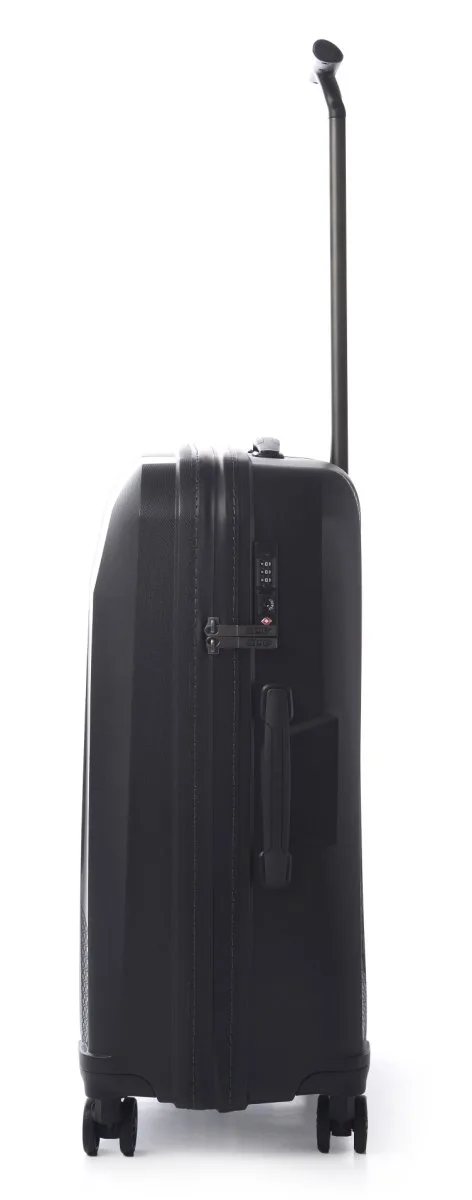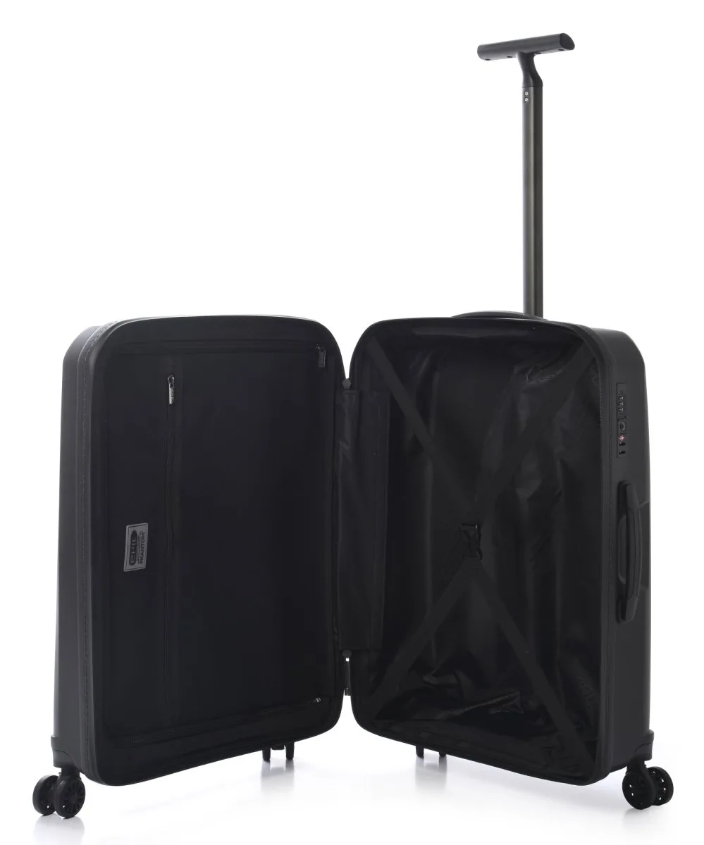 Ultraleichter 4-Rollen-Trolley mit Leiselaufrollen, flachintegriertem TSA Schloss, beidseitig Spannpackgurt, mit zusätzlicher Reissverschlusstasche, Accessories-Reissverschlusstasche und grosszügigem Laptop-Zusatzfach, integriert in der vorderen Aussenhülle.