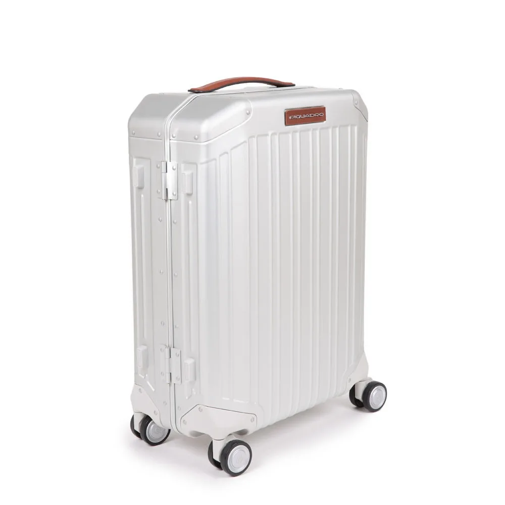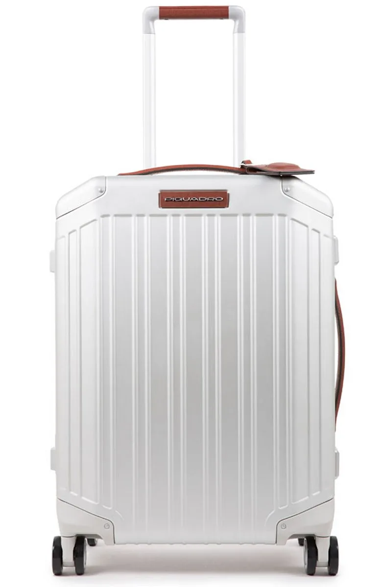 Ultra Slim Hartschalentrolley von Piquadro in Handgepäckgröße mit vier-Rollen, Doppelgestänge und versenkbaren Griffen. TSA Schloss, Adressschild. Der Smart Tracker funktioniert über die Connequ-App, die sowohl für Smartphones als auch für Smartwatches verfügbar ist. Alle verfügbaren Funktionen können über diese App gesteuert werden. Die Taschen und Trolleys von Piquadro können damit: