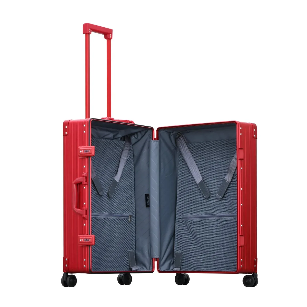 Dieser äusserst robuste Trolley besteht aus Flugzeugaluminium, das besonders langlebig und leicht ist und mit seiner genieteten Konstruktion sowie doppelt verstärkten Ecken für zusätzliche Stabilität sorgt. Zwei TSA Schlösser sorgen dafür, dass der Kofferinhalt stets sicher und geschützt bleibt. Eine eingebaute, nahtlose Gummidichtung macht das Gehäuse wasserdicht und hält Feuchtigkeit und Schmutz fern. Aleons Innenfutter ist schmutz- und wasserabweisend mit einem nicht abrasiv beschichteten Polyestergewebe, das den Gegenständen keinen Schaden zufügt.