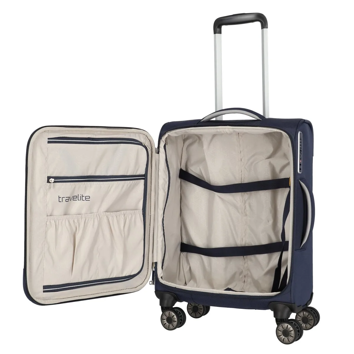 Der Handgepäck Trolley zeichnet sich vor allem durch die robusten Kanten aus. Der Koffer ist mit einem geräumigen Hauptfach mit zwei Packgurten, Nebenfächern und einem Aussenfach ausgestattet. So sind Ihre Reiseutensilien jederzeit sicher und geschützt verstaut. Der Trolley verfügt über ein versenktes TSA-Zahlenschloss, welches für Einreisen in die USA oder Kanada essentiell ist. Der Koffer lässt sich dank den 4 Doppelrollen, der arretierbaren Leichtmetall-Teleskopstange und den ergonomischen Oberhand- und Seitenhandgriffen angenehm transportieren.