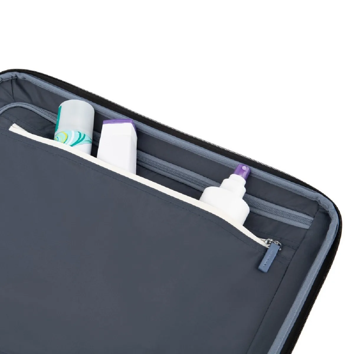 Innere Trennwände mit Reißverschluss und verstellbare Haltegurte sorgen dafür, dass der Inhalt organisiert, getrennt und gesichert bleibt. Mehrere Zubehörtaschen sorgen für Ordnung und eine wasserfeste Tasche bietet einen praktischen Platz zum Verstauen von feuchten Gegenständen oder Toilettenartikeln.