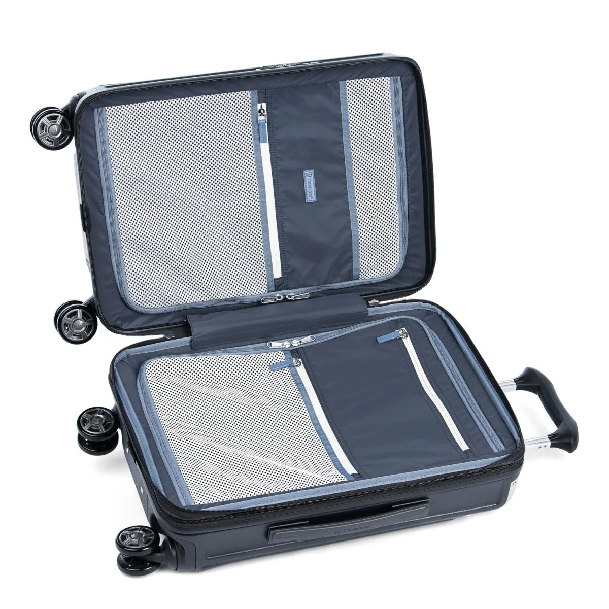 Das Clamshell-Design mit zwei Trennwänden mit Reißverschluss sorgt dafür, dass der Inhalt getrennt und sicher aufbewahrt werden kann. Mehrere Zubehörtaschen sorgen für Ordnung und eine praktische, wasserfeste Tasche bietet Platz für feuchte Gegenstände oder Toilettenartikel. Unterwegs fliegt diese kompakte Schönheit mit präziser Kontrolle und mühelosem Rollen, dank des exklusiven PrecisionGlide™-Systems von Travelpro® – acht selbstausrichtende MagnaTrac®-Spinner-Räder, die von einem robusten, vierfach verstellbaren PowerScope Lite-Griff mit komfortablem Contour Grip geführt werden.