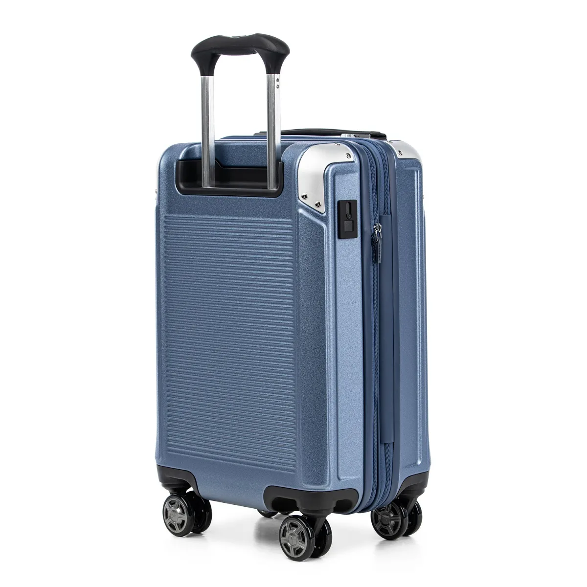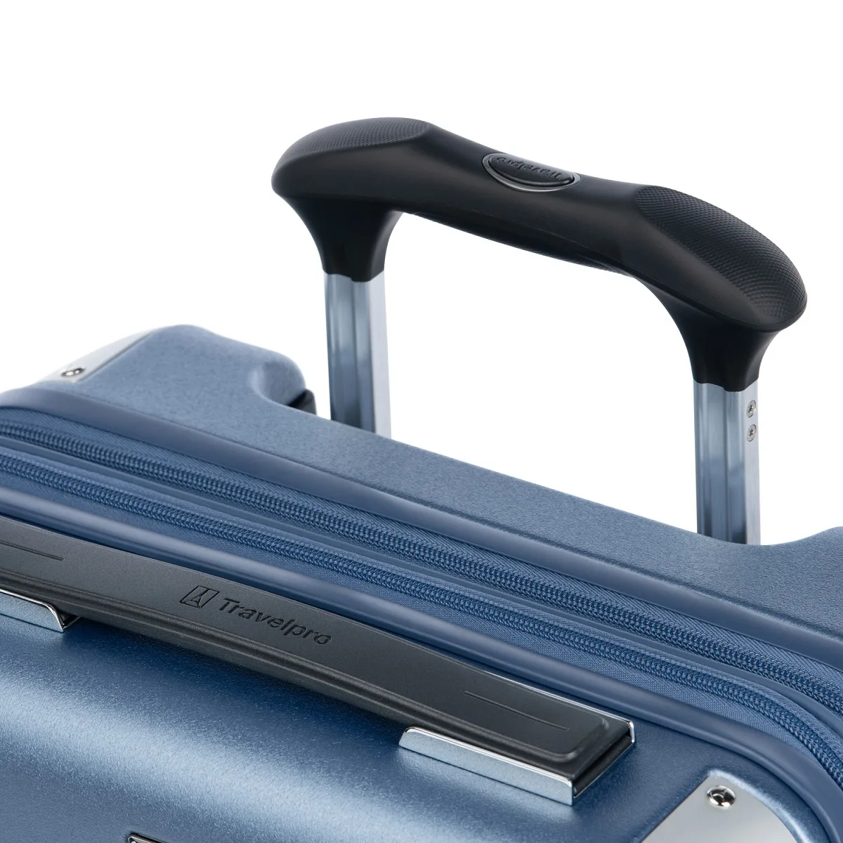 Das Clamshell-Design mit zwei Trennwänden mit Reißverschluss sorgt dafür, dass der Inhalt getrennt und sicher aufbewahrt werden kann. Mehrere Zubehörtaschen sorgen für Ordnung und eine praktische, wasserfeste Tasche bietet Platz für feuchte Gegenstände oder Toilettenartikel. Unterwegs fliegt diese kompakte Schönheit mit präziser Kontrolle und mühelosem Rollen, dank des exklusiven PrecisionGlide™-Systems von Travelpro® – acht selbstausrichtende MagnaTrac®-Spinner-Räder, die von einem robusten, vierfach verstellbaren PowerScope Lite-Griff mit komfortablem Contour Grip geführt werden.