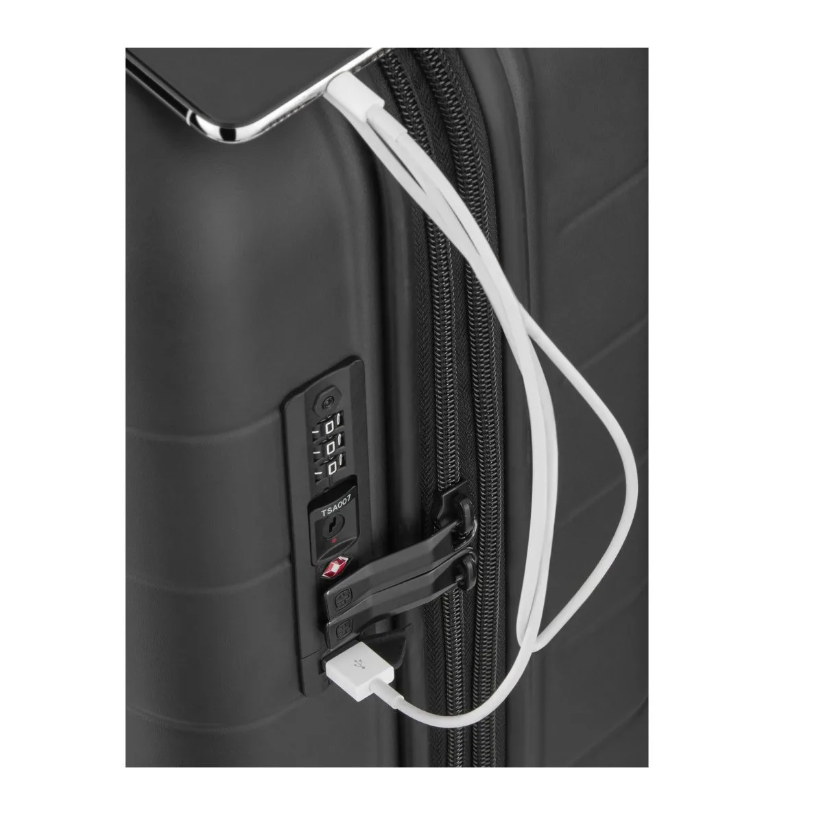 Ein ebenso robuster wie edler Handgepäckkoffer mit vier leicht laufenden, geräuscharmen Doppel-Transportrollen. Das formgepresste Frontfach schützt den Laptop , während im Schnellzugriffsfach wichtige Dinge umgehend zur Hand sind. Ein Sicherheitsreissverschluss und ein Zahlenschloss bieten ultimativen Diebstahlschutz. Den letzten Schliff bekommt dieser geräumige Koffer durch einen USB-Anschluss und ein integriertes Namensschild.